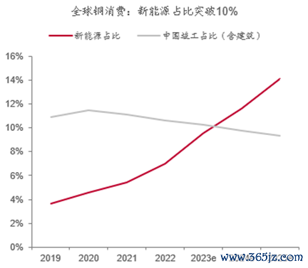 新能源领域对铜需求的增量,已基本上抵消了国内传统房地产下滑所带来的负面影响。近日,中泰证券研究所有色金属首席分析师谢鸿鹤曾表示,2023年全球新能源制造对铜铝的消费量已经占到总消费量的10%,而国内房地产竣工端对铜铝(指狭义的直接使用部分)的消费也在2023年被“压缩”到了10%附近。