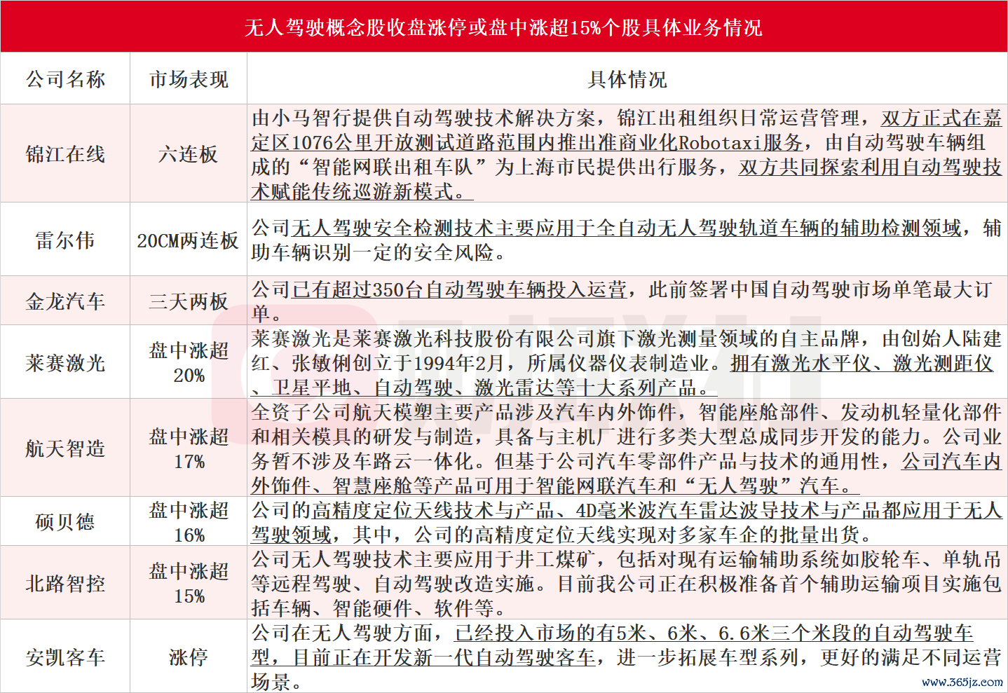 受上海预计最快一周内面向市民启动无人驾驶汽车公测且全程免费以及深圳巴士集团计划于2024年内在深圳前海推广20台自动驾驶公交车等多重利好消息刺激,无人驾驶概念股持续强势。锦江在线收盘六连板、雷尔伟连续两个20CM涨停、金龙汽车三天两板、莱赛激光盘中涨超20%、航天智造盘中涨超17%、硕贝德盘中涨超16%、北路智控盘中涨超15%,安凯客车收盘涨停。