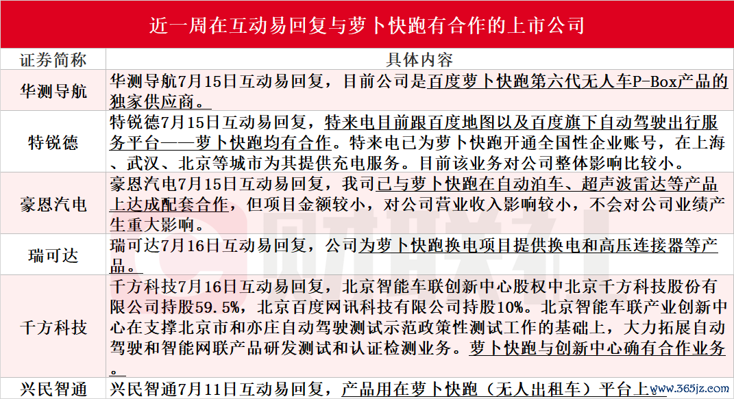 据不完全梳理在线配资平台,近一周在互动平台回复无人驾驶网约车相关业务的A股上市公司包括中科创达、长安汽车、四维图新、天准科技、美格智能、万马科技和中国汽研;近一周在互动易回复与萝卜快跑有合作的上市公司包括华测导航、特锐德、豪恩汽电、瑞可达、千方科技和兴民智通;今年以来在互动易回复与小马智行有合作的上市公司包括祥鑫科技、四维图新、昆仑万维、锦江在线和中国外运。