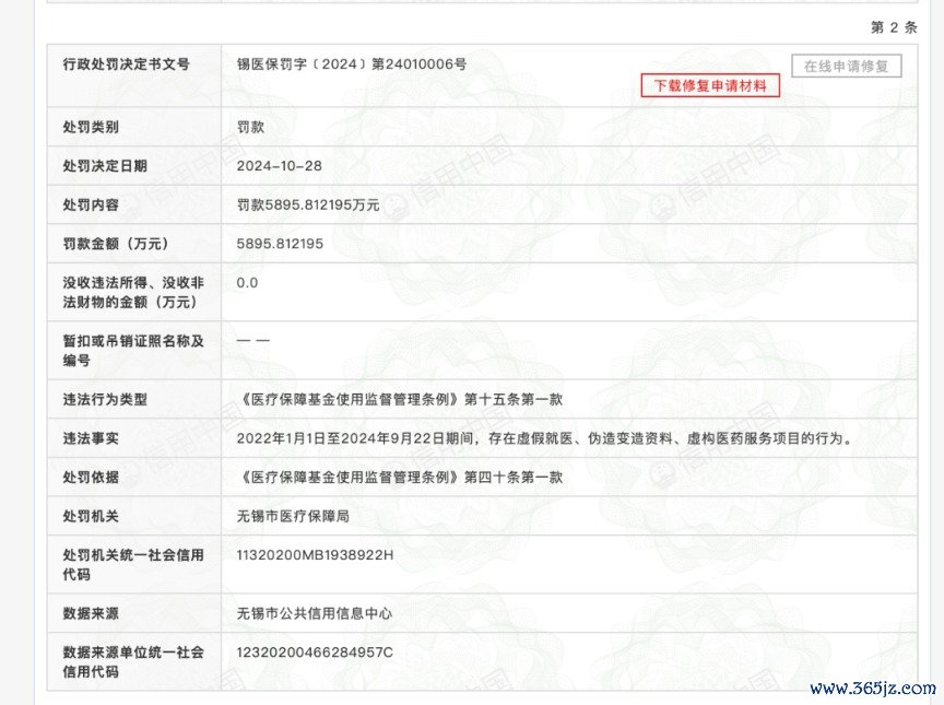 另据信用中国网站公示的信息,因在2022年1月1日至2024年9月22日期间,存在虚假就医、伪造变造资料、虚构医药服务项目的行为。无锡虹桥医院有限公司于10月28日被无锡市医疗保障局罚款5895.81万元。